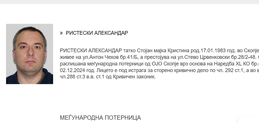 МВР распиша меѓународна потерница по 41-годишниот адвокат Александар Ристески од Скопје, кој е осомничен дека на 25 ноември со умисла се обидел да ги запали просториите на Адвокатската комора, подметнувајќи пожар на скалите во зградата во која е сместена Комората.