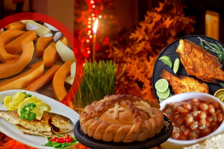Меѓу јадењата, најпочесно место заземаат посниот грав, питата со зелка или со праз, посните сармички, рибите, урмите, сушените смокви, бадемите, нескршени ореви (постои верување дека ако оревот кога ќе го скршите не е црвлив, ќе имате бериќет во претстојната година), јужните овошја (мандарини, портокали), јаболката, костените и баклавата. На масата треба да стои и запалена свеќа украсена со бадниково гранче.