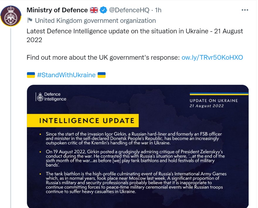 Во својот извештај, Министерството наведува дека од руската инвазија на земјата, Игор Гиркин, руски тврдокорен и поранешен офицер на ФСБ (Федерална служба за безбедност )и министер во самопрогласената Народна Република Доњецк, станал „сè поостар критичар на руското постапување во војната. “