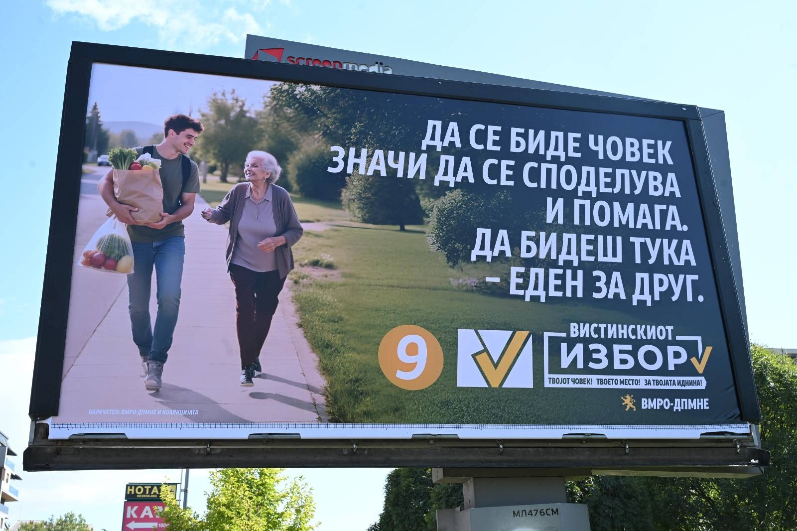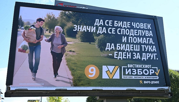 Во фокусот на јавноста се појави билборд на ВМРО-ДПМНЕ, на кој насмеано момче и повозрасна жена чекорат кон подоброто утре, спремни за прекрасните градови со новите градоначалници од редовите на владејачката партија кои ќе направат бум во општините, според идеалната замисла на партијата. Момчето носи намирници од продавница, веројатно ѝ помага на жената, а слоганот е: „Да се биде човек значи да се споделува и помага. Да бидеш тука — еден за друг“.