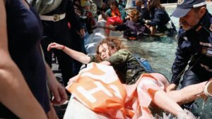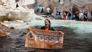 Седум млади активисти кои денеска протестираа против климатските промени влегоа во водата во Фонтаната Треви во Рим и истурија разреден јаглен во неа за да добие црна боја.