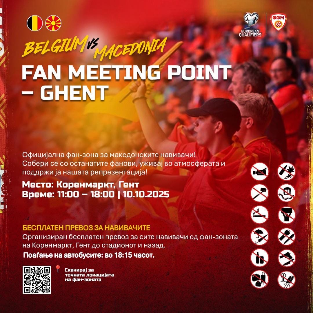 Фудбалската федерација на Македонија ги информира сите навивачи дека пред натпреварот Белгија – Македонија ќе биде организирана официјална фан-зона за македонските навивачи.