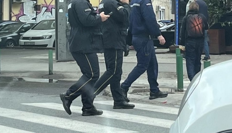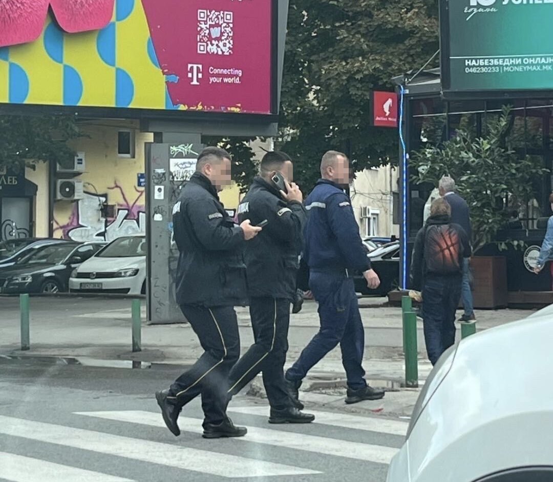 На фотографијата се забележува група полицајци кои преминуваат на пешачки премин на булевар во Скопје, при што еден од нив зборува на телефон, а друг гледа во телефонот кој го држи во рака.