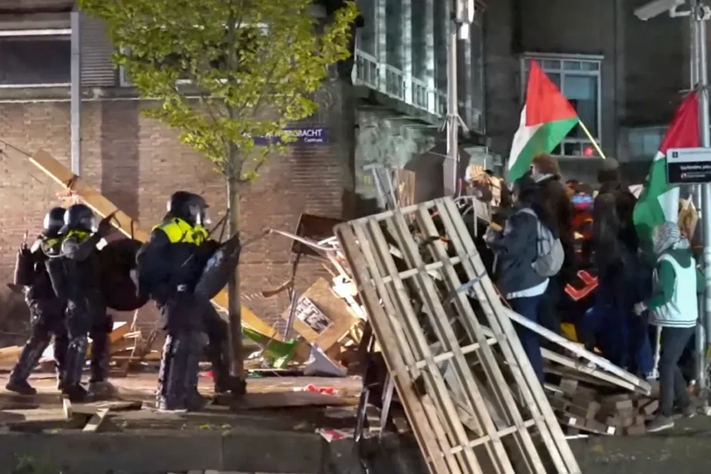 Неколку стотици демонстранти ги продолжија демонстрациите околу кампусот на Универзитетот во Амстердам во Холандија, каде што полицијата беше снимена како ги тепа со палка и им ги крши шаторите откако тие одбија да го напуштат теренот.