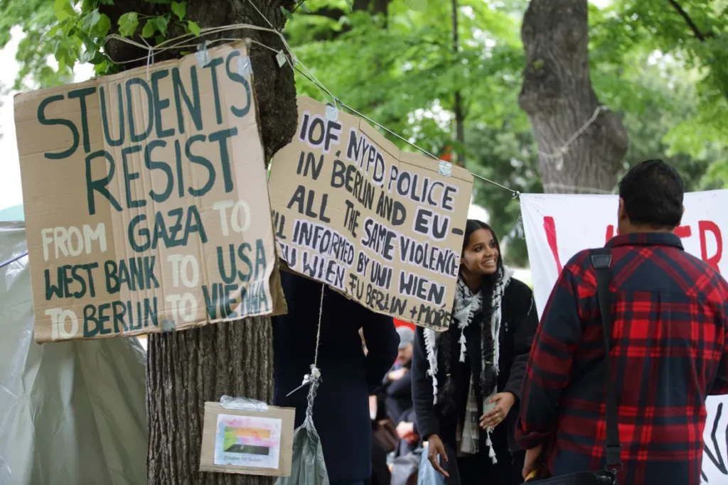 Во Австрија, десетици демонстранти се кампуси во кампусот на Универзитетот во Виена, поставувајќи шатори и нижејќи транспаренти од доцна во четвртокот.