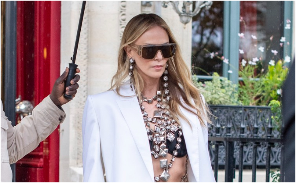 Оскаровката пристигна во Париз на модната ревија на „Живанши“ во бел костум со блескав горен дел со скапоцени камења под него. Изгледот беше вистински моден подарок: комбинација од строга елеганција и авангарден гламур, зачинета со впечатливи обетки, заштитни очила и скулптурални сандали.