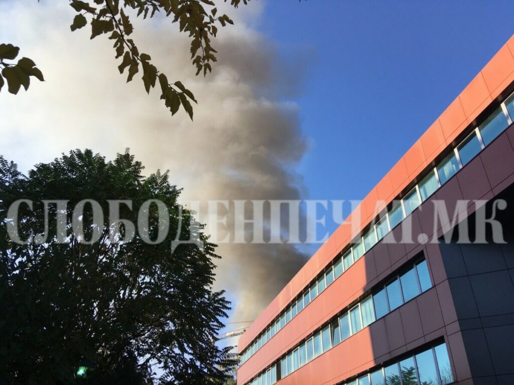 Две противпожарни возила на скопската пожарна се на местото на позарот и се обидуваат да ги изгаснат пламените јазици кои го зафатија објектот и избиваат низ азбестниот покрив.