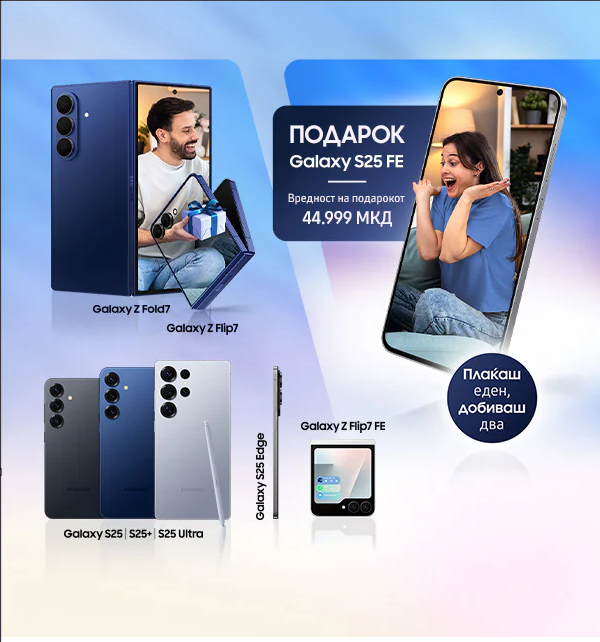 И токму кога ќе помислиш дека совршенството е недостижно, Samsung додава емоција. Преку промоцијата „Кого ќе израдуваш?“, можеш да подадеш насмевка што трае подолго од секој подарок. Од 2 до 31 октомври 2025, купи еден од најновите модели: Galaxy Z Fold7, Z Flip7, Z Flip7 FE, S25 Ultra, S25/S25+ или S25 Edge и добиј подарок Galaxy S25 FE, телефон вреден 44.999 МКД. Регистрирај го купувањето на samsung.com најдоцна до 17 ноември, а подарокот ќе пристигне директно на твојата адреса. Задржи еден Galaxy за себе, а другиот подари го на личноста која ти значи затоа што најубавите подароци се токму оние што не ги планираме.
