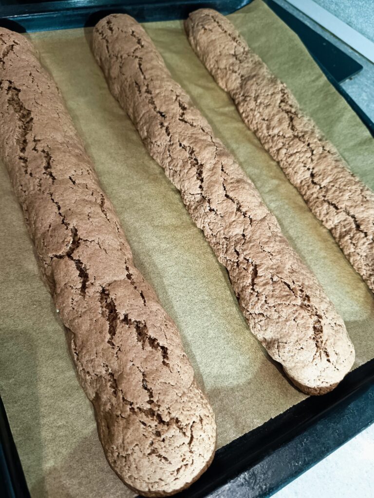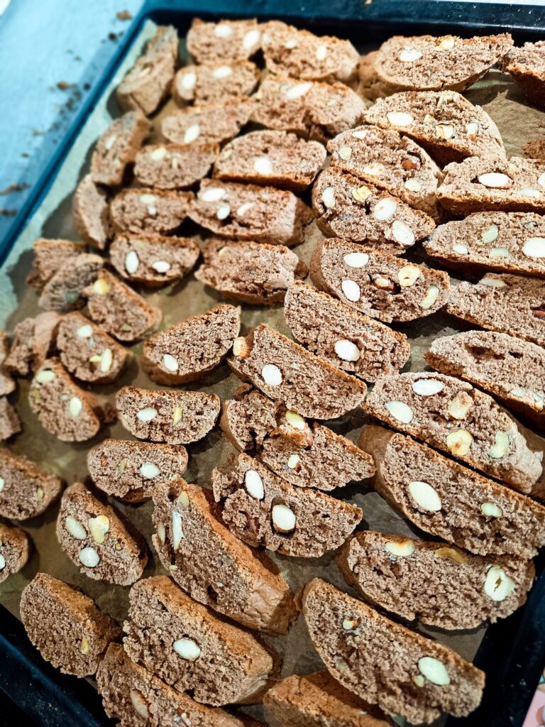 Во сувата смеса додајте ги јајцата, омекнатиот путер, ванилата и ликерот. Замесете сѐ додека не добиете хомогена и мазна смеса. Додајте ги лешниците и бадемите, претходно малку потпечени за посилен вкус. Тестото ќе стане богато и малку поцврсто – токму како што треба. Поделете го тестото на три еднакви дела и оформете долги, тенки ролати. Наредете ги на хартија за печење. Ставете ги во претходно загреана рерна на 180 степени Целзиусови и печете околу 25-30 минути, сè додека не добијат убава кора. Извадете ги и додека се топли, внимателно исечете ги на коси парчиња со дебелина 1,5-2 см – карактеристичниот изглед на кантучи. Вратете ги исечените парчиња во рерната и допечете уште 10 минути, додека не добијат златно-кафеава боја и совршено крцкава текстура.
