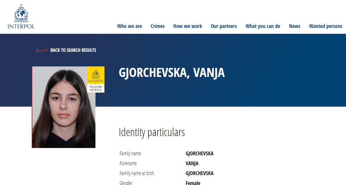 Распишана е меѓународна потерница за ичезнатата Вања Ѓорчевска од страна на Интерпол на барање на Министерството за внатрешни работи.