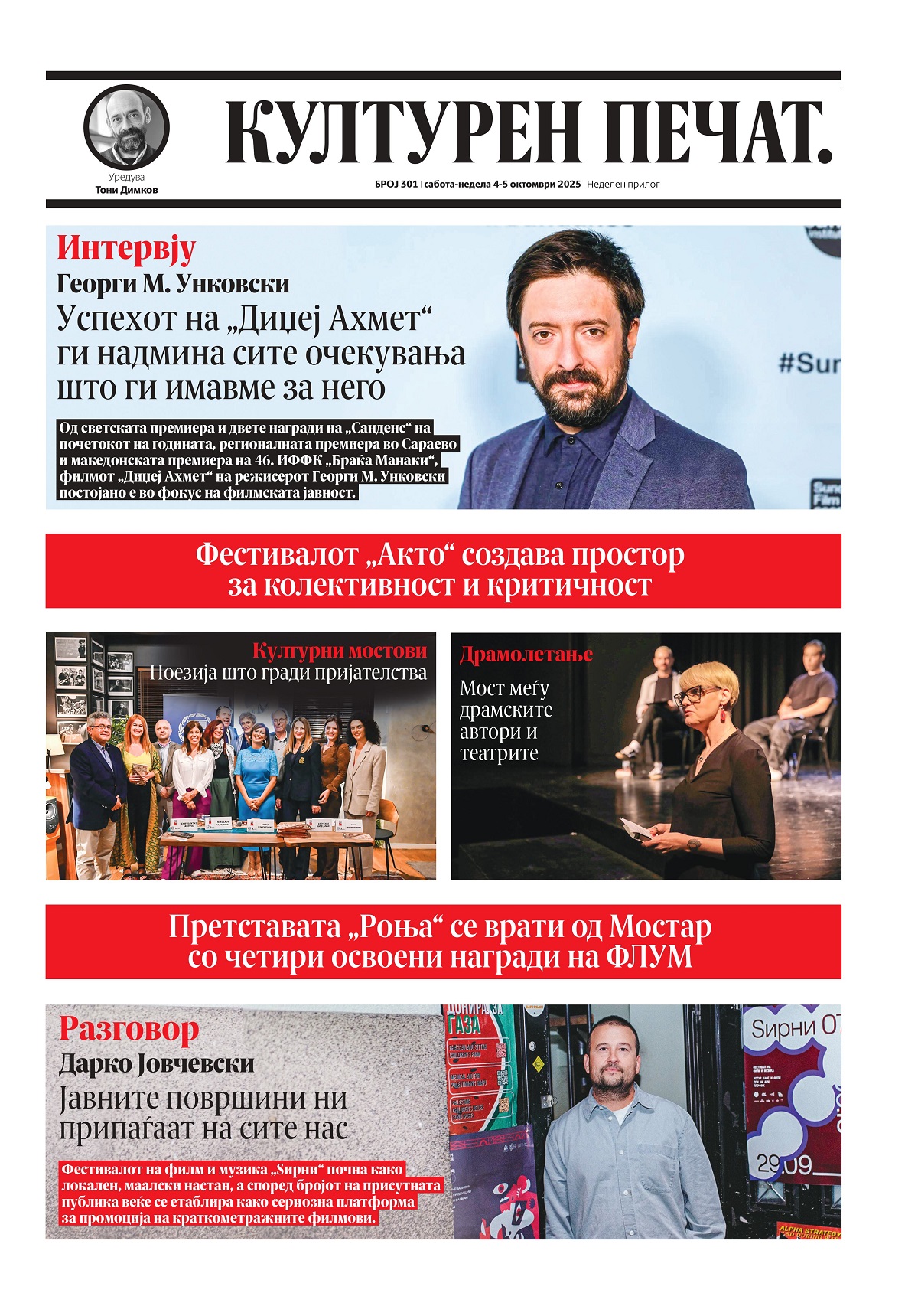 КУЛТУРЕН ПЕЧАТ број 301, во печатеното издание на весникот „Слободен печат“ (4-5.10.2025), во својот стандарден формат на осум страници меѓу содржините од областа на уметноста и културните настани има: