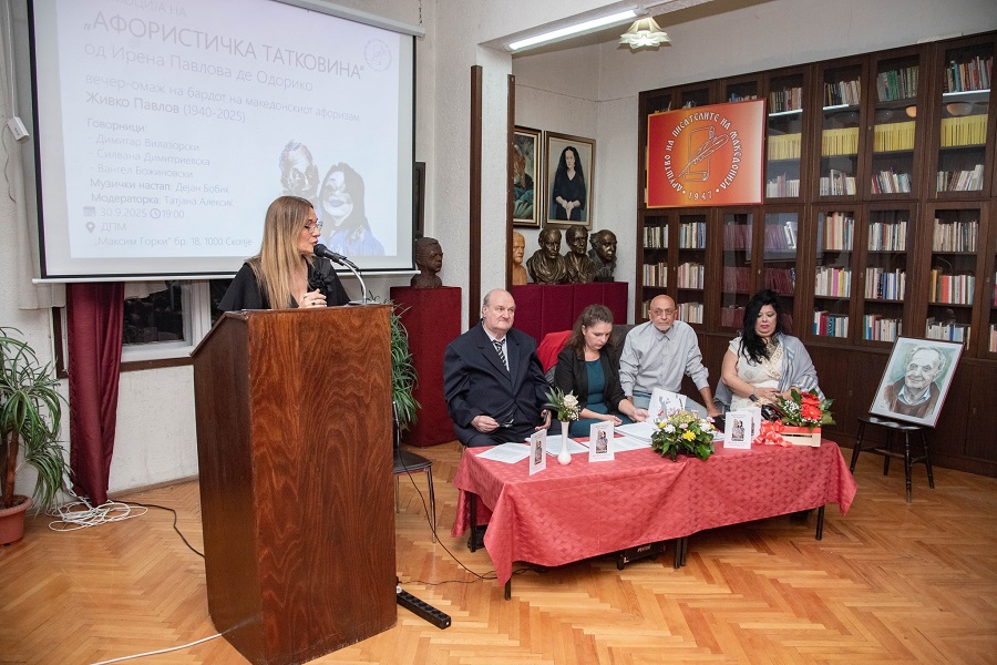Промоцијата на „Афористичка татковина“ (издание на „Интеракција плус“, 2023), која авторката ја посветува на својот татко, неодамна починатиот водечки македонски афорист Живко Павлов, воедно беше омаж на овој бард на македонскиот хумор и сатира.