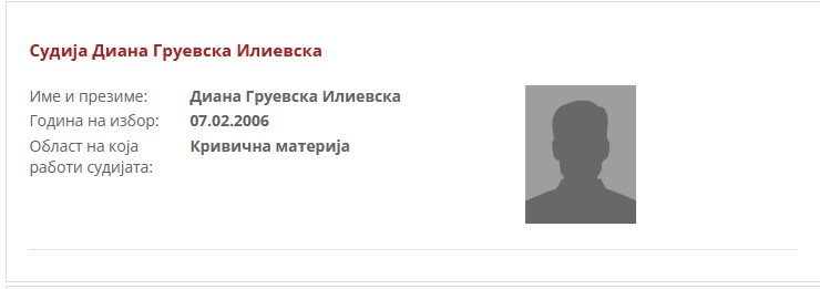 За судијката Диана Груевска Илиевска која ќе го води еден од најголемите судски процес во историјата на земјава со над 30 обвинети којшто ќе биде под будното око на јавноста на веб страницата нема ниту фотографија, ниту професионална биографија. Единствено пишува дека за судија била избрана во 2006 година и дека работи во областа кривична материја.