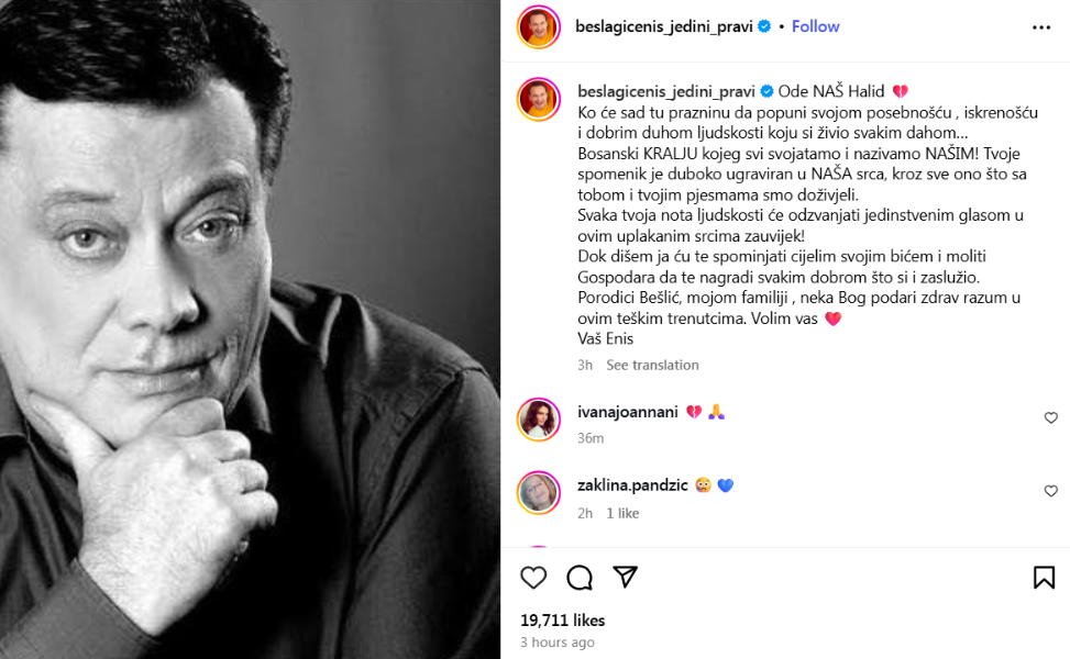Легендарниот пејач Халид Бешлиќ почина на 71-годишна возраст по кратка и тешка борба со болест. Веста за неговата смрт ја потресе целата јавност во регионот, бидејќи зад себе остави повеќе од четири децении музика, безвременски хитови и генерации што растеа со неговите песни.