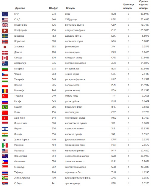 Според курсната листа на НБРСМ средниот курс на еврото денеска изнесува 61.6947 денари, а на американскиот долар 52.4883 денари. Средниот курс на британската фунта изнесува 70.7427 денари.