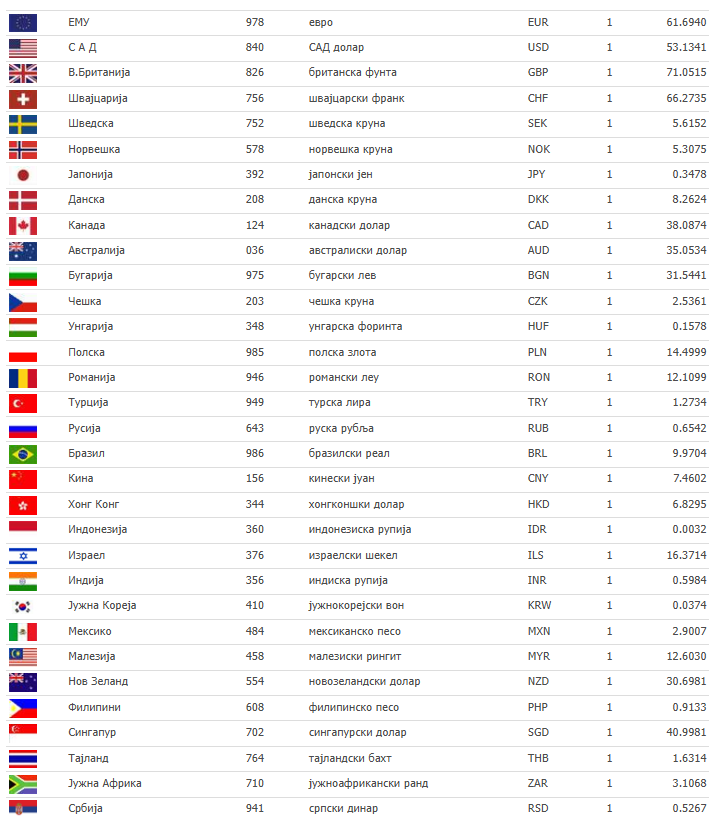 Според курсната листа на НБРСМ средниот курс на еврото денеска изнесува 61.6940 денари, а на американскиот долар 53.1341 денари. Средниот курс на британската фунта изнесува 71.0515 денари.