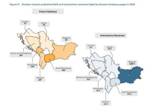 Според извештајот, руските амбасади во балканските земји активно шират пропаганда на Фејсбук, но најголемо влијание врз општеството има руската амбасада во Софија. Во извештајот е анализирана бројката на објави на Фејсбук од руски амбасади во неколку земји, меѓу кои и во Македонија, како и вниманието и реакциите што тие ги предизвикале. Според податоците, на прво место од регионот по делување изминатава година е руската амбасада во Скопје која имала 1987 објави на Фејсбук, на второ место е руската амбасада во Подгорица која во истиот период имала 1199 објави, во Софија со 871, во Тирана 639 во Сараево со 294, во Белград 192 и во Загреб само 35.
