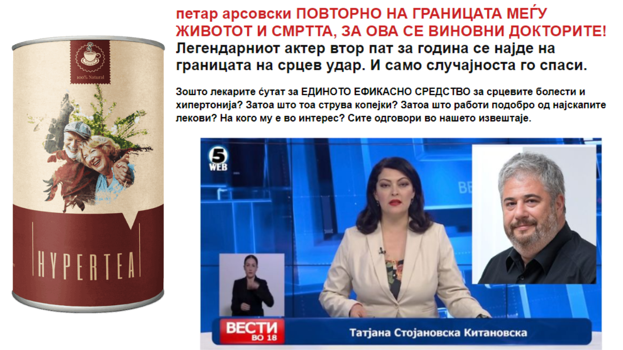 Во интервјуто Арсовски невистинито е презентиран како „македонски актер“ кој „паднал поради хроничен висок крвен притисок и се здобил со скршеница“. Фантазијата на маркетинг гуруата кои стојат зад овие измами, оди дотаму што тие ги обвинуваат докторите што наводно го хоспитализирале Арсовски – дека го третирале само за скршеницата а не и за срцевата слабост, односно дека не му давале терапија. За да се добие на драматичност, во лажното интервју се вклучува и невистинито тврдење дека „македонскиот доктор Драган Даниловски му препишал на Арсовски билно средство за чистење на крвните садови – Хипертеа и така состојбата почнала да му се подобрува“.