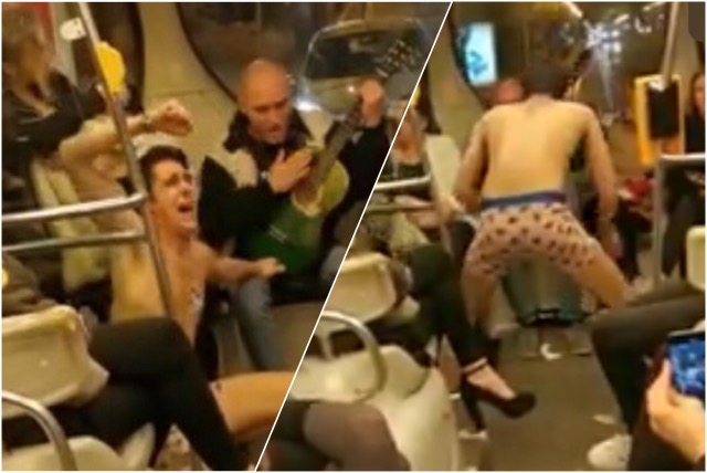 На снимката се гледа како едно од лицата „дава ритам“ и свири на гитара, додека другиот облечен само во долен веш и чорапи на себе, недолично и агресивно се однесува во трамвајот додека ги скандира стиховите.