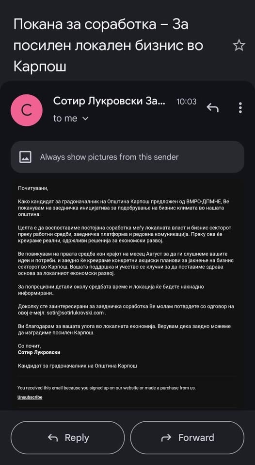 Од Општината сметаат дека на ваков начин со директно упатување на покана на адреса на фирмите и установите за средби се врши притисок врз директорите на јавните установи, училиштата и фирмите. Земањето податоци од правни лица и праќање на мејлови за бизнис средби како претставник на политички субјект е флагрантно кршење на законите и форма на досега невиден притисок врз обични стопанственици. Во случајов, Лукровски не знае ама премиерот знае, дека кандидат за градоначалник се станува тогаш кога Државната изборна комисија ќе ја признае кандидатурата и дека кампања се води во точно утврден временски рок. Затоа, го повикуваме премиерот Мицкоски да го едуцира својот избраник за начините на водење на кампања, притоа да избегнува притисоци и доколку тој тоа не го стори, истиот ќе мора да биде корегиран од Основното јавно обвинителство, затоа што прави груби повреди не само на на Изборниот законик, туку и на низа други закони, се вели во соопштението од Општина Карпош.