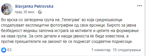 Бирото за јавна безбедност веднаш започна истрага за мотивите и целите на формирање на групата „Јавна соба“ на социјалната мрежа „Телеграм“ во која македонски средношколци споделуваат порнографски фотографии од свои врснички, информира на својот Фејсбук профил, заменик министерка за внатрешни работи, Славјанка Петровска.