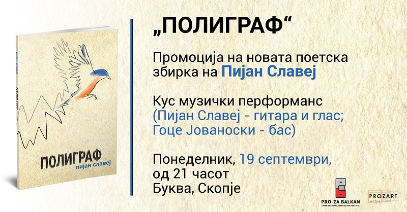 Музички перформанс на Пијан Славеј и промоција на неговата трета поетска книга „Полиграф“ ќе се одржи вечерва (19 септември), во 21 часот, во кафе-книжарницата „Буква“ во Скопје. Промоцијата се одржува во рамките на 10. издание на Интернационалниот литературен фестивал „Про-за Балкан“, кој беше отворен синоќа во Даут-пашиниот амам во Скопје.