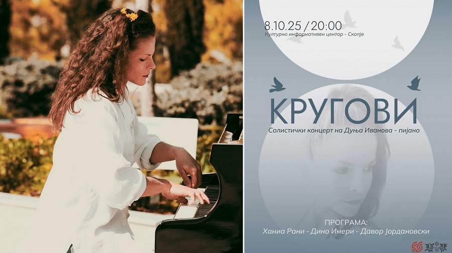 Во Културно-информативниот центар во Скопје на 8 октомври, во 20 часот, во „Салон 19:19“ солистички концерт со наслов „Кругови“ ќе одржи пијанистката Дуња Иванова. На концертот ќе бидат изведени дела од Дино Имери, Давор Јордановски и Ханија Рани.
