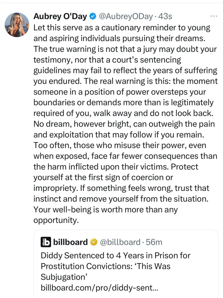 Американската пејачка Обри О’Деј се огласи откако нејзиниот поранешен ментор Шон Диди Комбс беше осуден на повеќе од четири години затвор. Музичарката ги предупреди младите музичари да се заштитат себеси кога работат со луѓе „на моќни позиции“, пишува „Пејџ сикс“.