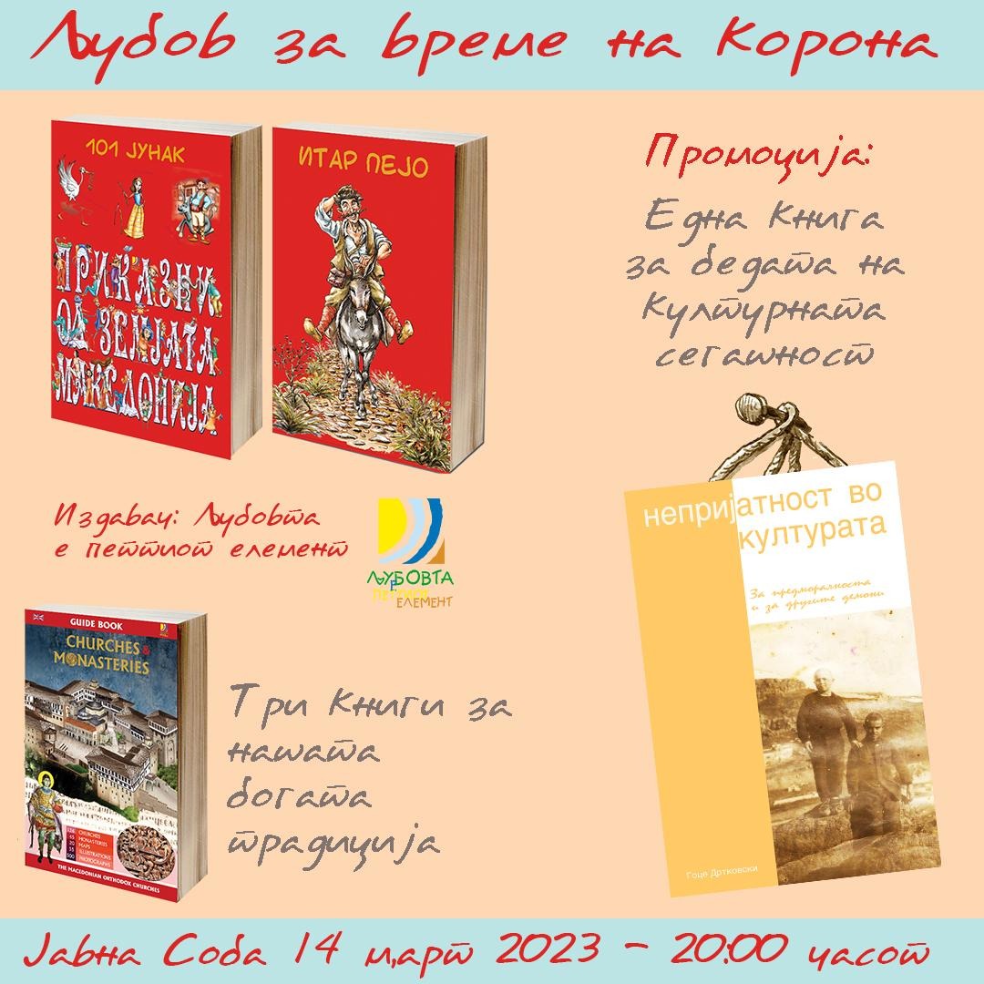 Во скопскиот културен простор Јавна соба утревечер (вторник) во 20 часот издавачката куќа „Љубовта е петтиот елемент“ од Скопје ќе ја промовира новата книга на Гоце Дртковски „Непријатност во културата“, со поднаслов „За предморалноста и другите демони“. На промоцијата наречена „Љубов за време на корона“, ќе бидат претставени уште три книги за нашата богата традиција – „Итар Пејо“, „Приказни од земјата Македонија“ и „Цркви и манастири“.