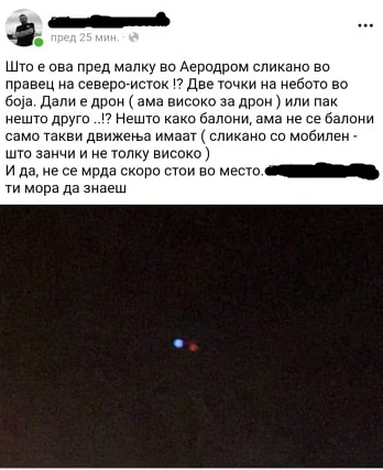 Жителите на општина Аеродром вечерва забележија две светли точки на небото. Граѓаните по социјалните мрежи се запрашуваа што значат светлата што според фотографиите се гледа дека се во црвена и сина боја.