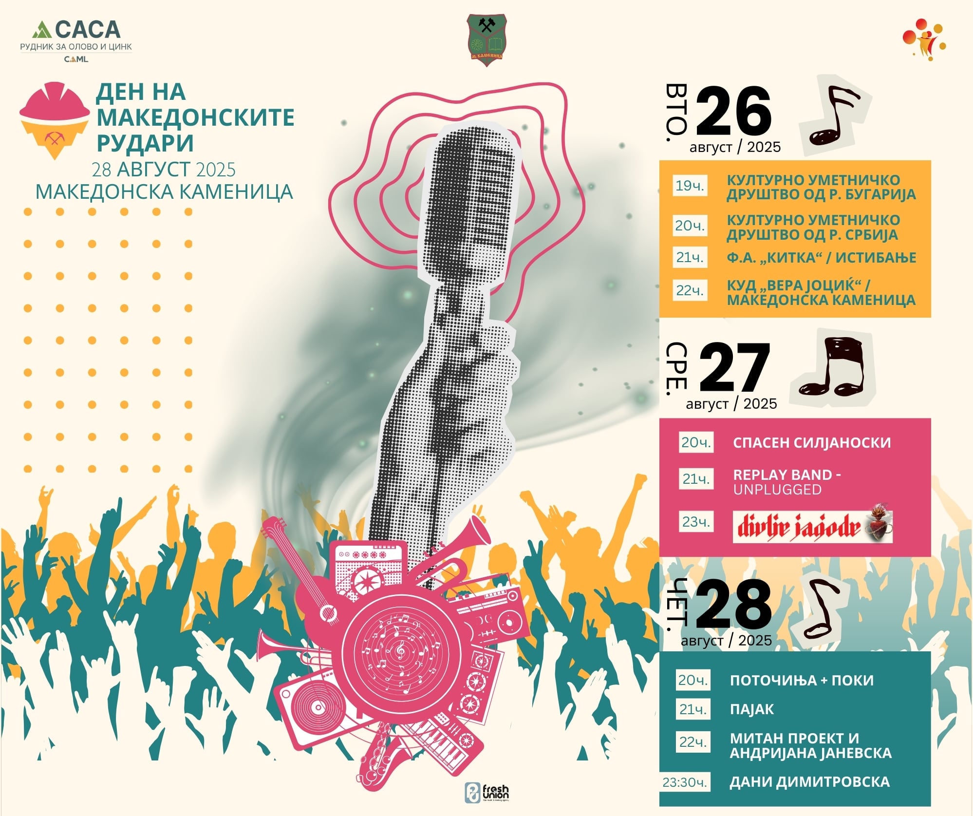Македонска Каменица и оваа година со гордост го одбележува Денот на рударите – 28 август, со тридневна културно-музичка програма што ќе ја претвори градската сцена во центар на традицијата, современите звуци и незаборавните емоции.