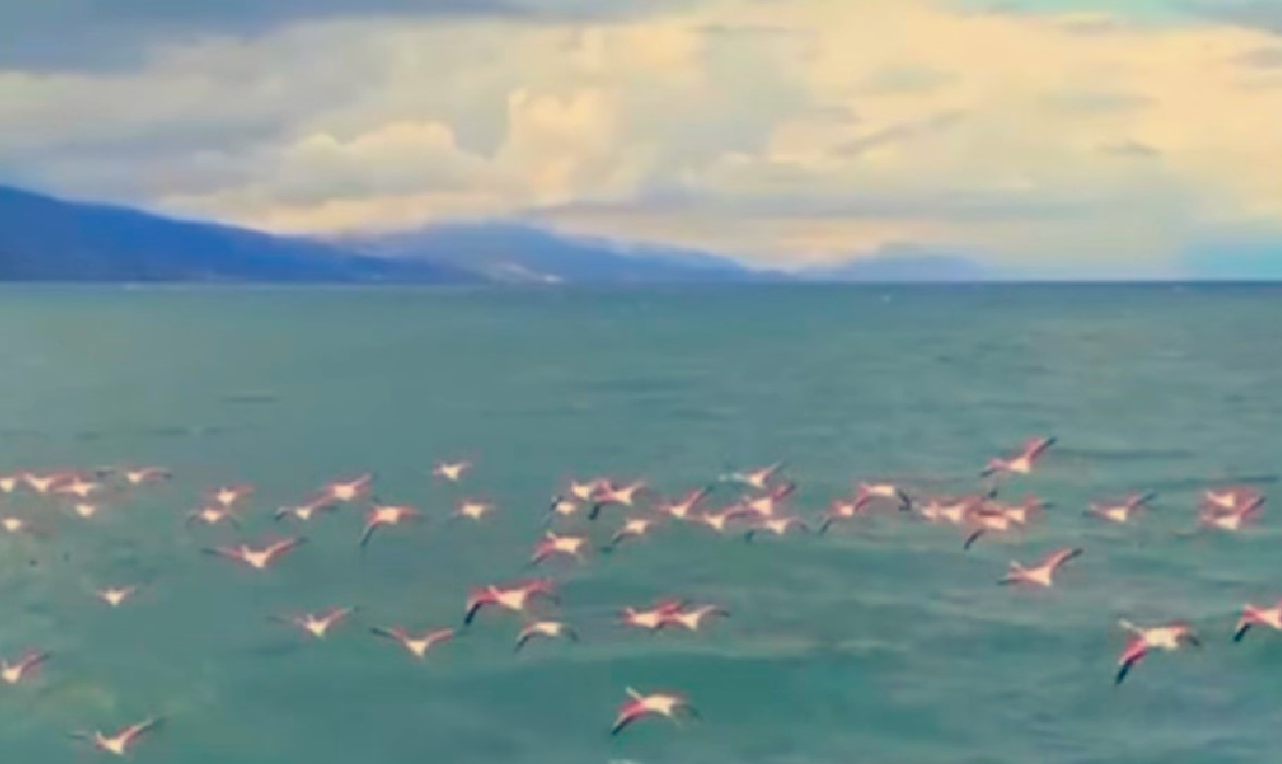 ВИДЕО: Големо јато фламинга во грациозен лет над Охридското Езеро, на пат кон топлиот југ