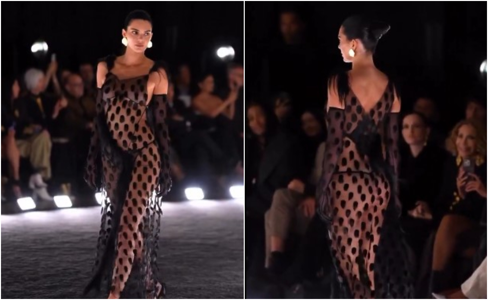 Затворајќи ја ревијата на „Скијапарели“ за пролет 2026, Кендал Џенер прошета во целосно проѕирен фустан прошаран со прамени крзно, а нејзиниот изглед го освои интернетот.