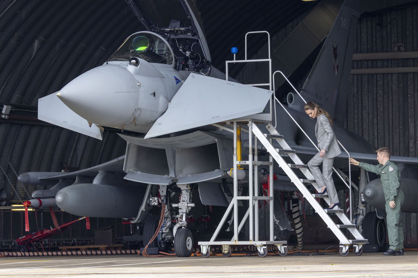 Мидлтон ги воодушеви сите кога се искачи по скалите во високи потпетици и ѕирна во пилотската кабина на воен авион. Кејт се искачи по скалите без да ги гледа, а потоа импресионираше со своите вештини во симулатор за летање. Откако го прегледа авионот, Кејт се врати по истите скали, исто така без никакви проблеми.